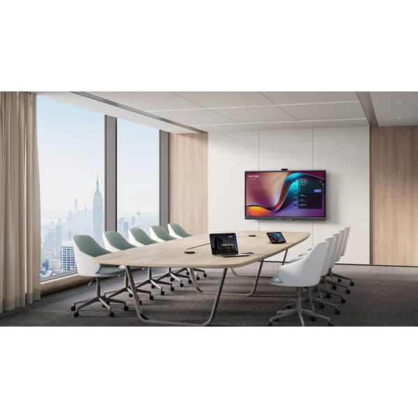 Das Display verfügt über einen 65-Zoll-4K-PCAP-Touchscreen mit UHD-Auflösung und Anti-Glare-Beschichtung. Es verfügt über eine integrierte 4K-Kamera mit KI-gestütztem Auto Framing und Speaker Tracking. Integrierte Stereolautsprecher und ein 16-Mikrofon-Array sorgen für eine klare Kommunikation für alle Teilnehmer.